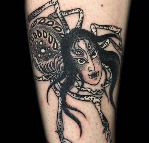 邪恶的女鬼面蜘蛛和蜘蛛网纹身图案