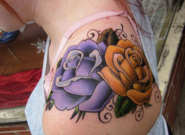 美女披肩彩色的玫瑰纹身图案
