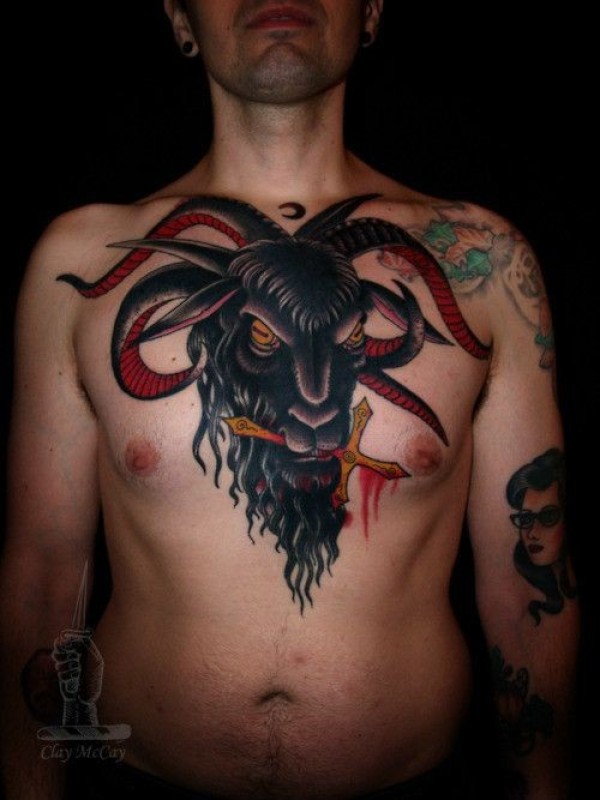 男人胸膛血色十字架羊头纹身图案