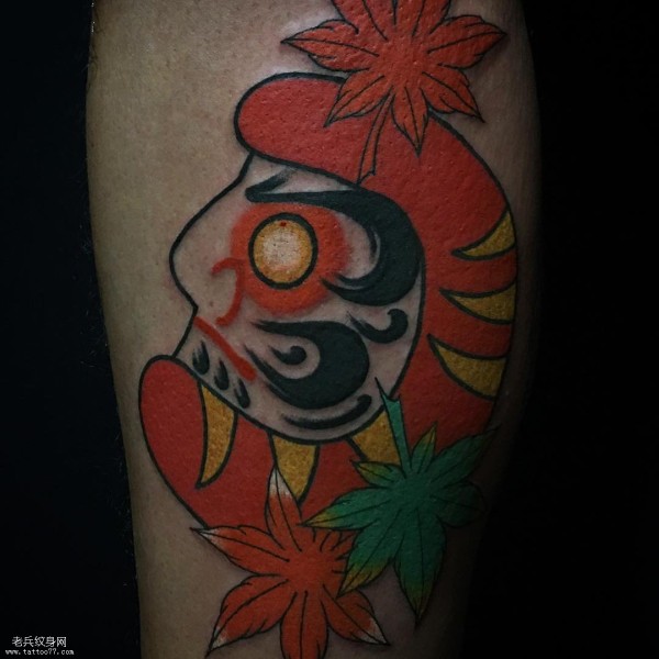 小腿枫叶达摩头像纹身图案