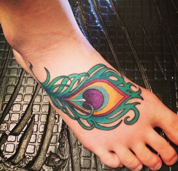 女性小腿脚背上漂亮的孔雀羽纹身图案
