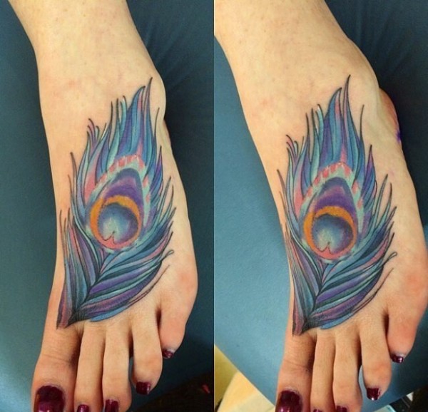 女性小腿脚背上漂亮的孔雀羽纹身图案