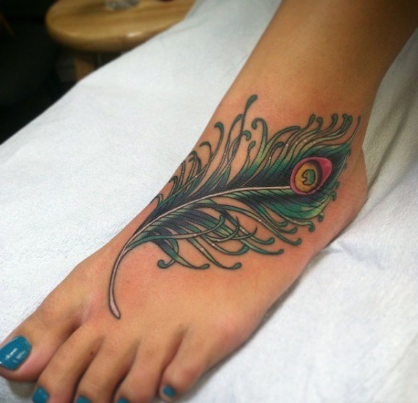 女性小腿脚背上漂亮的孔雀羽纹身图案