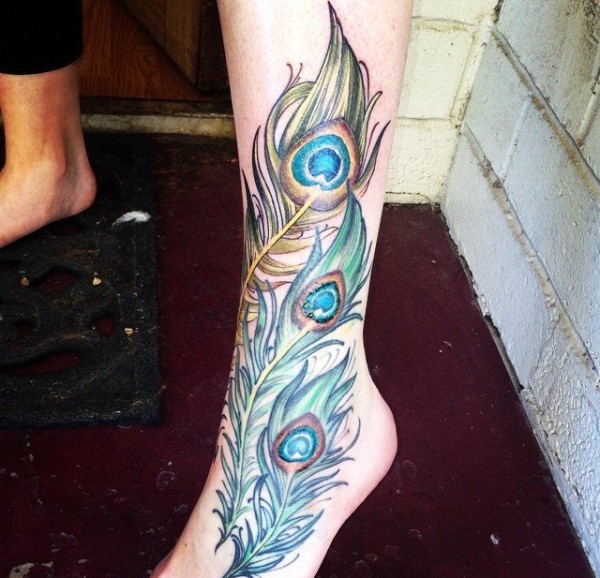 女性小腿脚背上漂亮的孔雀羽纹身图案