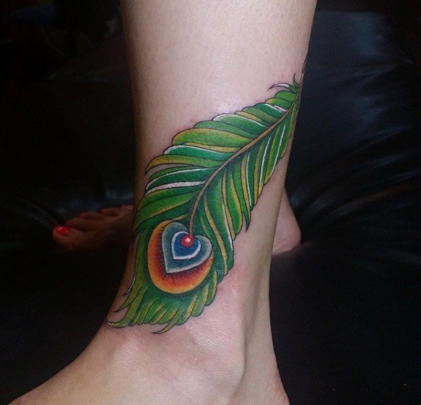 女性小腿脚背上漂亮的孔雀羽纹身图案