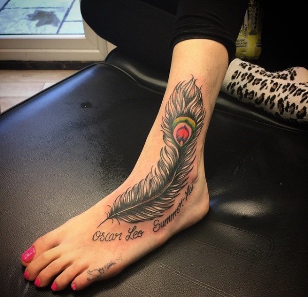 女性小腿脚背上漂亮的孔雀羽纹身图案