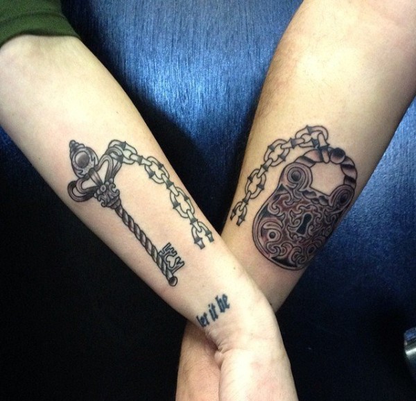 情侣恋人之间代表紧密一起的钥匙和锁头纹身图案