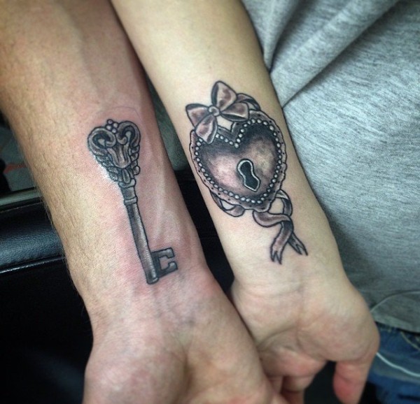 情侣恋人之间代表紧密一起的钥匙和锁头纹身图案