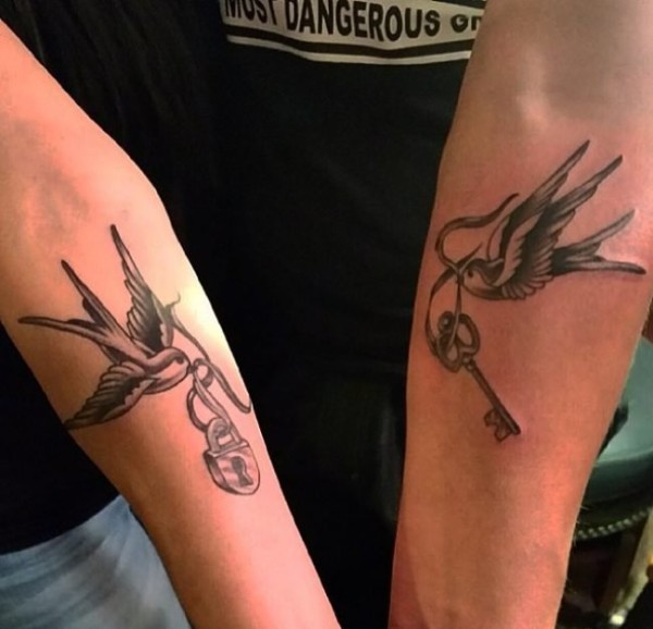情侣恋人之间代表紧密一起的钥匙和锁头纹身图案