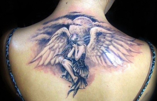女性后背上哭泣的黑灰天使纹身