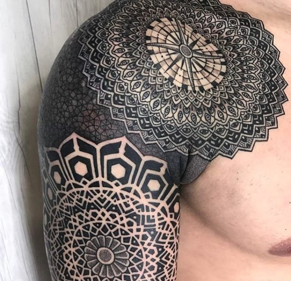 男性超霸气的几何满臂纹身图案来自纹身师尼萨科