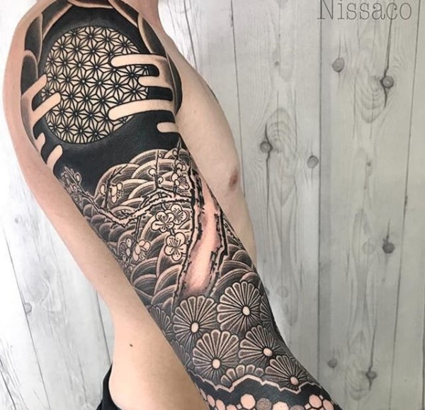 男性超霸气的几何满臂纹身图案来自纹身师尼萨科