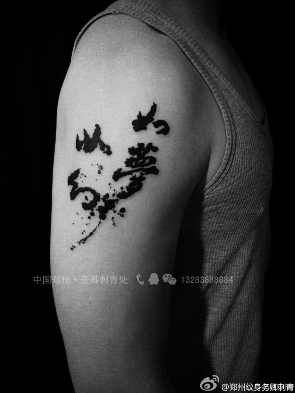 如梦如幻四字,以中国草书书法加以泼墨设计。