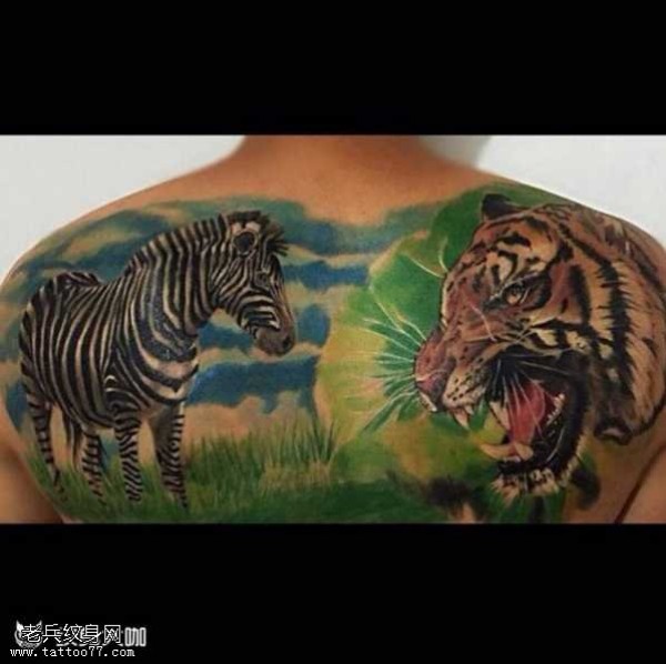 背部老虎与斑马纹身图案