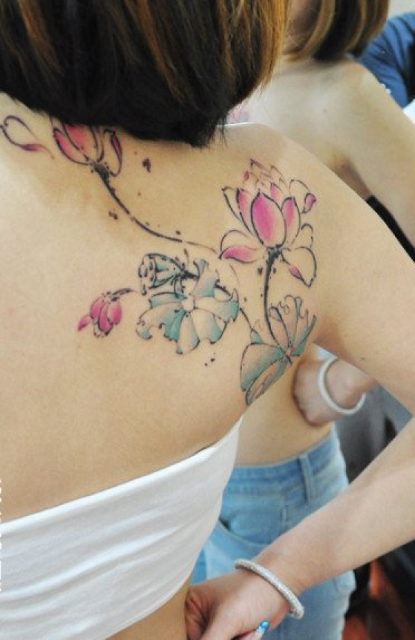 美女后背漂亮的彩色水墨荷花纹身图案