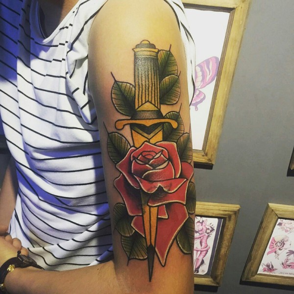 带刺玫瑰,手臂匕首玫瑰彩绘纹身图案