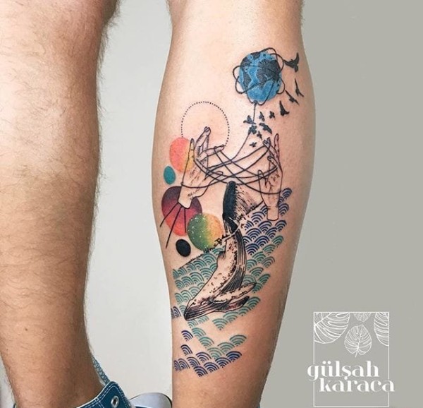 海洋里可爱的小动物纹身黑灰色鲸鱼纹身图案