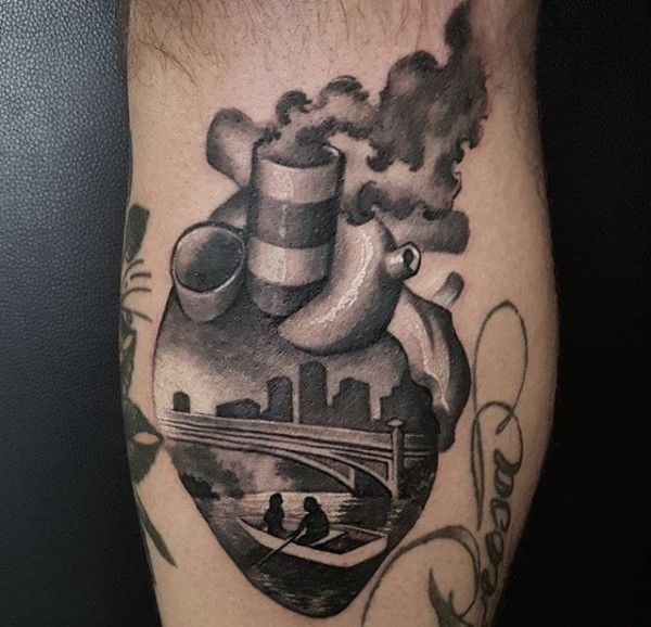 黑灰色场景机械心脏纹身图案来自于纹身师加布里