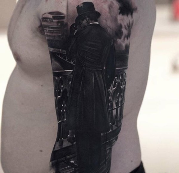 经典的黑灰色花臂纹身图案来自于男纹身师西尔瓦诺