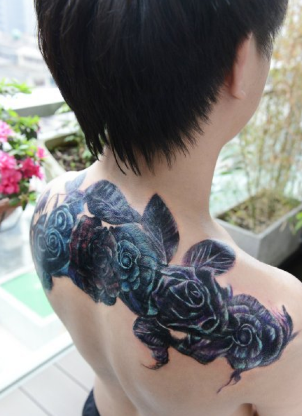 男生妖艳帅气的披肩玫瑰花纹身图案