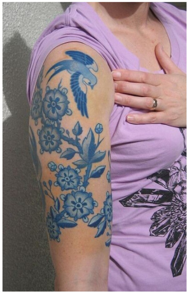 女性手臂上漂亮时尚的花蕊燕子刺青