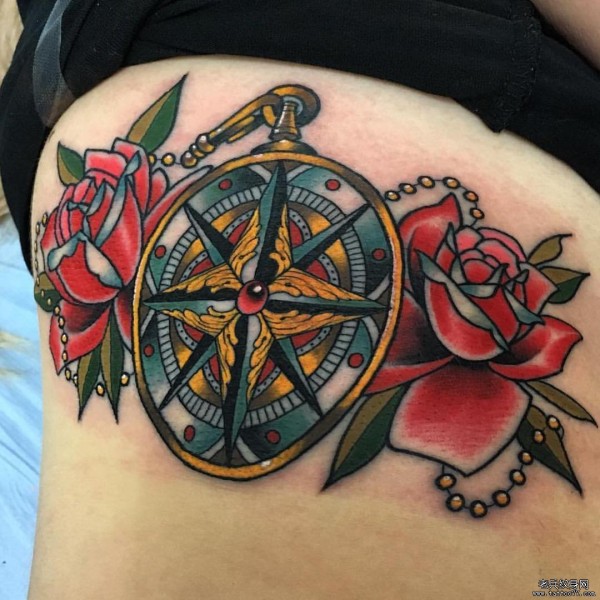 侧腰彩绘old school罗盘玫瑰花纹身图案