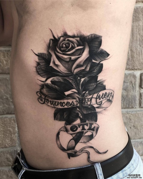 侧腰欧美new school黑灰玫瑰花纹身图案