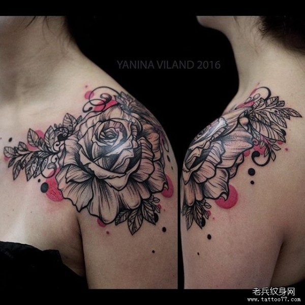 女生肩花纹身_15张女性双肩对称的肩花纹身图案作品图片