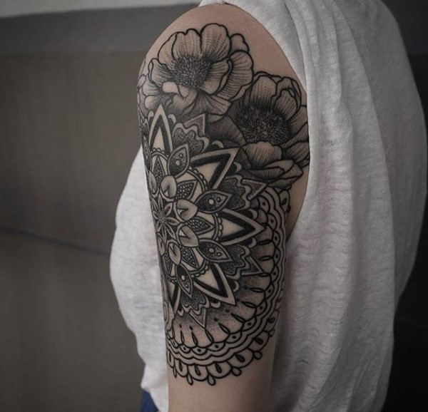 迷人的黑灰色曼陀罗图案纹身来自于纹身师曼纽尔