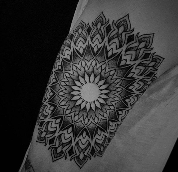 迷人的黑灰色曼陀罗图案纹身来自于纹身师曼纽尔
