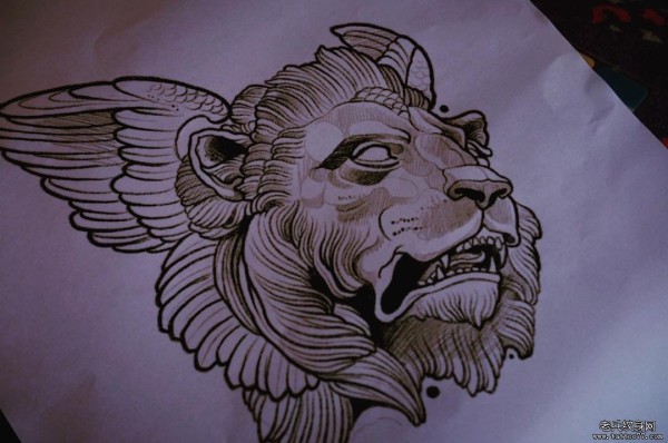 长翅膀的狮子school纹身图案手稿