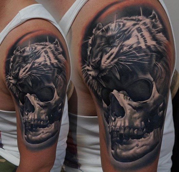 超帅时尚的黑灰骷髅与蛇纹身图案