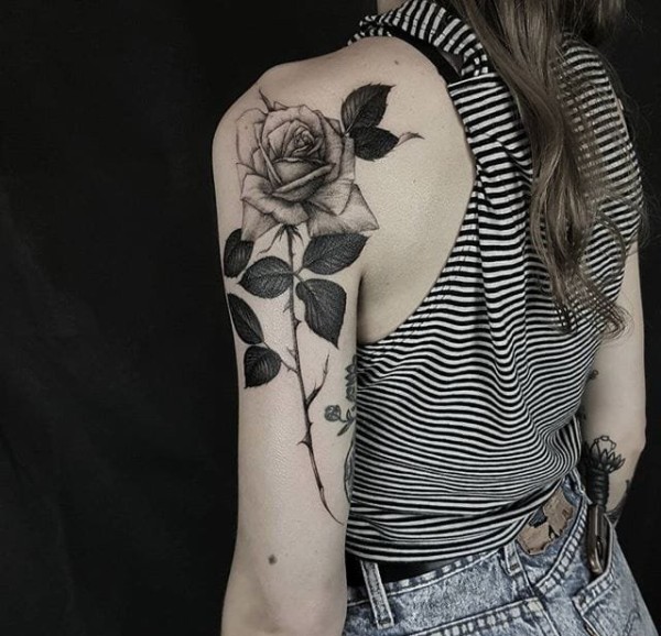 漂亮的黑灰色细线条玫瑰花纹身图案来自于纹身师爱德温