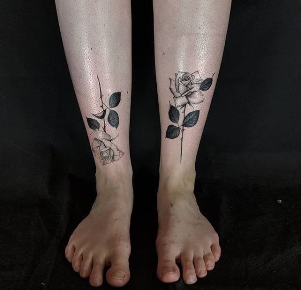 漂亮的黑灰色细线条玫瑰花纹身图案来自于纹身师爱德温