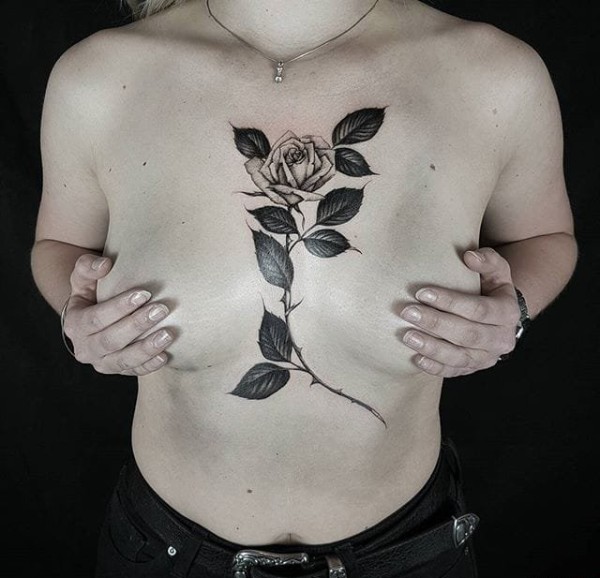 漂亮的黑灰色细线条玫瑰花纹身图案来自于纹身师爱德温