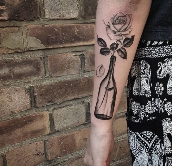漂亮的黑灰色细线条玫瑰花纹身图案来自于纹身师爱德温