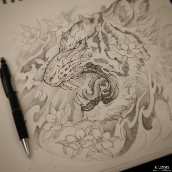 传统老虎和花蕊纹身图案手稿