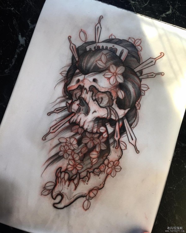 骷髅艺妓和樱花纹身图案手稿