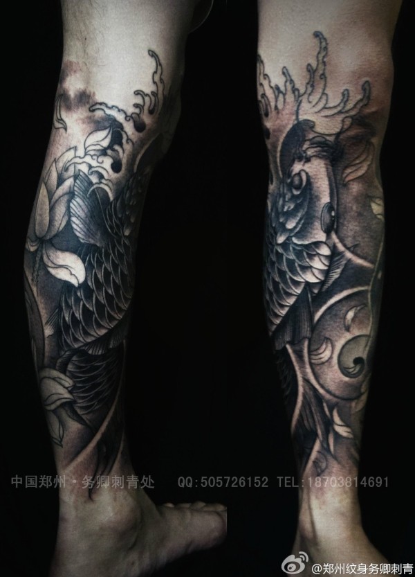 传统鲤鱼花小腿纹身_腿部纹身图案大全_纹身图吧
