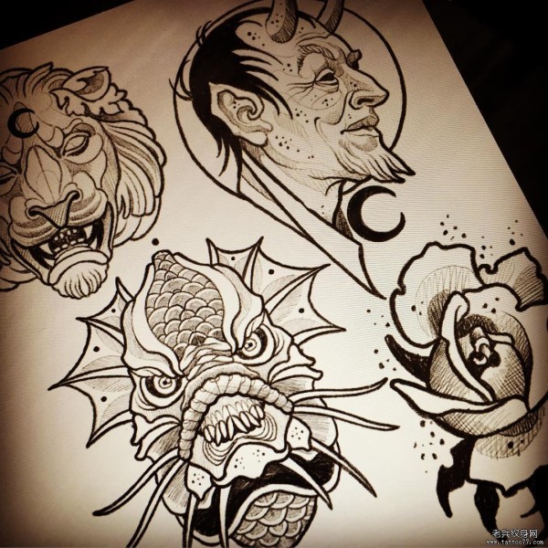 龙纹身手稿_一组老传统黑灰龙手稿纹身图案