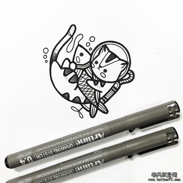 卡通猫潜水抓鱼纹身图案手稿
