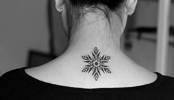 女生后颈部黑色雪花图腾纹身