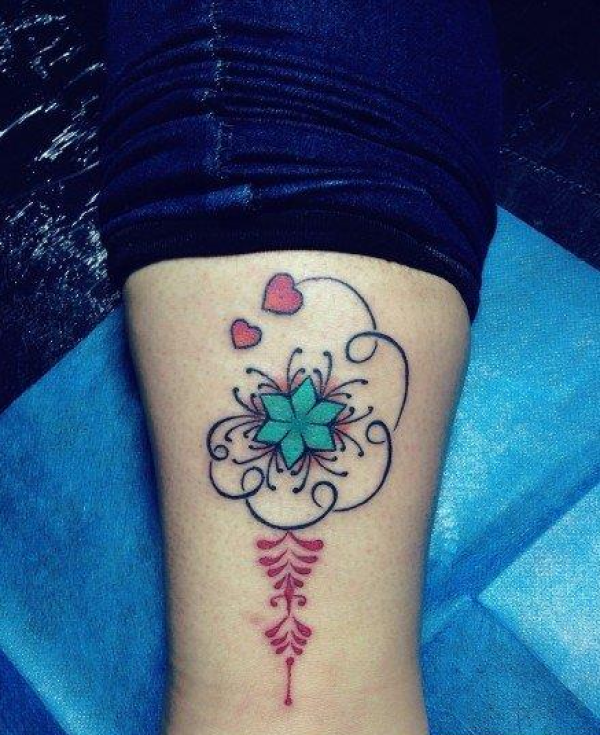 潮流雅观的靓女腿部彩色花蕊爱心纹身