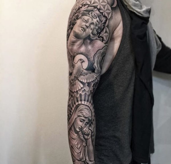 满臂人物肖像黑灰色袖子纹身图案来自李尔