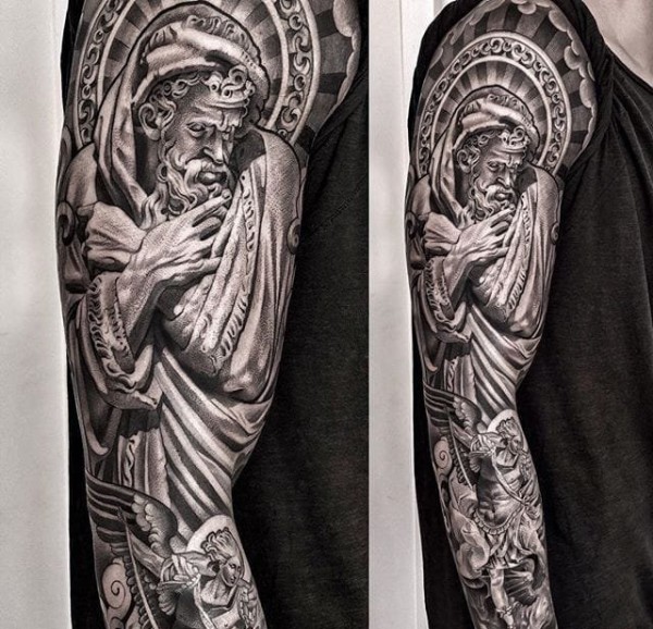 满臂人物肖像黑灰色袖子纹身图案来自李尔