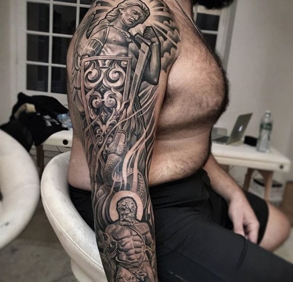 满臂人物肖像黑灰色袖子纹身图案来自李尔