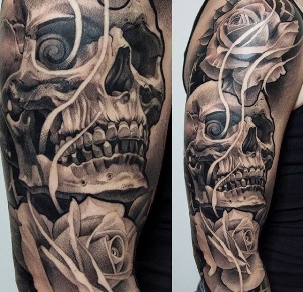 满臂人物肖像黑灰色袖子纹身图案来自李尔