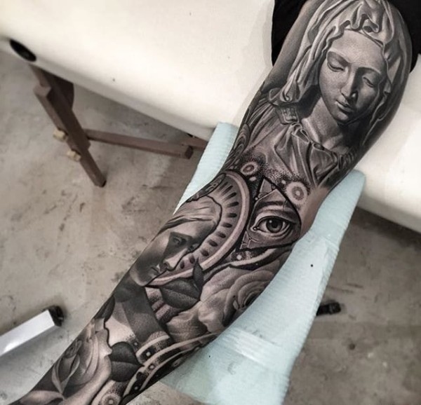 满臂人物肖像黑灰色袖子纹身图案来自李尔