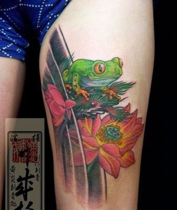 大腿上的青蛙和荷花纹身图片
