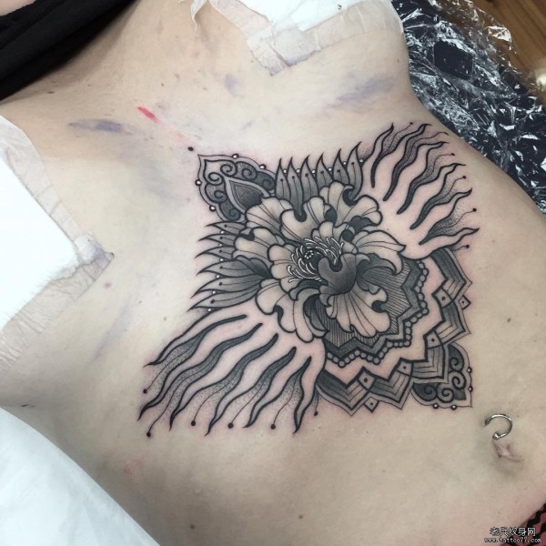 胸部性感菊花梵花黑灰纹身tattoo图案